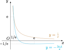 分析与解 法一 根据题意,有\[\forall x>0,\left(a-\dfrac 1x\right)\left(a+\dfrac{\ln x}x\right)\geqslant 0,\]也即\[\forall x>0,a\leqslant \min\left\{\dfrac 1x,-\dfrac{\ln x}x\right\}\lor a\geqslant \max\left\{\dfrac 1x,-\dfrac{\ln x}x\right\}.\]考虑其反面,为\[\exists x>0,\min\left\{\dfrac 1x,-\dfrac{\ln x}x\right\}< a < \max\left\{\dfrac 1x,-\dfrac{\ln x}x\right\},\]用导数研究函数 $y=-\dfrac{\ln x}x$,并作出 $y=\dfrac 1x$ 与 $y=-\dfrac{\ln x}x$ 的图象如下: