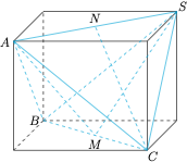 设长方体的三维分别为 $a,b,c$,且\[\begin{cases} a^2+b^2=SA^2,\\ b^2+c^2=SB^2,\\ c^2+a^2=SC^2,\end{cases}\iff \begin{cases} a^2+b^2=4,\\ b^2+c^2=5,\\ c^2+a^2=3,\end{cases}\iff \begin{cases} a=1,\\ b=\sqrt 3,\\ c=\sqrt 2,\end{cases}\]因此以 $B$ 为坐标原点,长方体在 $B$ 处的三条棱的方向为正方向建立空间直角坐标系,则 $S(0,\sqrt 3,\sqrt 2)$,$A(1,0,\sqrt 2)$,$B(0,0,0)$,$C(1,\sqrt 3,0)$,进而\[M\left(\dfrac 12,\dfrac{\sqrt 3}2,0\right),\quad N\left(\dfrac 12,\dfrac{\sqrt 3}2,\sqrt 2\right).\]于是\[\begin{cases} \overrightarrow{AM}=\left(-\dfrac 12,\dfrac{\sqrt 3}2,-\sqrt 2\right),\\ \overrightarrow{CN}=\left(-\dfrac 12,-\dfrac{\sqrt 3}2,\sqrt 2\right),\end{cases}\]于是与它们均垂直的向量\[\overrightarrow n=\left(0,\sqrt 2,\dfrac{\sqrt 3}2\right),\]而 $\overrightarrow{MN}=\left(0,0,\sqrt 2\right)$,因此所求距离\[d=\dfrac{\left|\overrightarrow{MN}\cdot \overrightarrow n\right|}{ \left|\overrightarrow n\right|}=\dfrac{\dfrac{\sqrt 6}2}{\sqrt{2+\dfrac 34}}=\dfrac{\sqrt{66}}{11}.\]