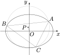 已知椭圆 $\dfrac{x^2}{a^2}+\dfrac{y^2}{b^2}=1$ 的内接三角形 $ABC$ 的外心为 $P$,$O$ 为坐标原点,直线 $AB,BC,CA,OD$ 的斜率均存在,求证:直线 $AB,BC,CA,OP$ 的斜率之积为定值.