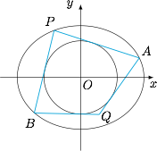1、设 $P$ 点的坐标为 $\left(\sqrt 3\cos\theta,\sqrt 2\sin\theta\right)$,$PA,PB,QA,QB$ 的斜率分别是 $k_1,k_2,k_3,k_4$.设过点 $P$ 的直线方程为$$y-\sqrt 2\sin\theta=k\left(x-\sqrt 3\cos\theta\right),$$则该直线与圆 $x^2+y^2=1$ 相切,即$$\dfrac{\left|\sqrt 2\sin\theta-\sqrt 3k\cos\theta\right|}{\sqrt{1+k^2}}=1,$$也即$$\left(3\cos^2\theta-1\right)k^2-2\sqrt 6\sin\theta\cos\theta\cdot k+2\sin^2\theta-1=0,$$于是$$k_1+k_2=\dfrac{2\sqrt 6\sin\theta\cos\theta}{3\cos^2\theta-1}=\dfrac{2\sqrt 6\sin 2\theta}{3\cos 2\theta+1},k_1k_2=\dfrac{2\sin^2\theta-1}{3\cos^2\theta-1}=\dfrac{-2\cos 2\theta}{3\cos 2\theta+1},$$也即$$\cos 2\theta=\dfrac{-k_1k_2}{3k_1k_2+2}, \sin 2\theta=\dfrac{k_1+k_2}{3\sqrt 6k_1k_2+2\sqrt 6}.$$这样我们就有$$\left(\dfrac{-k_1k_2}{3k_1k_2+2}\right)^2+\left(\dfrac{k_1+k_2}{3\sqrt 6k_1k_2+2\sqrt 6}\right)^2=1,$$整理,得$$48k_1^2k_2^2-\left(k_1^2+k_2^2\right)+70k_1k_2+24=0.$$上式中将 $\left(k_1,k_2\right)$ 换成 $\left(k_1,k_3\right)$,$\left(k_2,k_4\right)$ 依然成立,因此有 $k_2,k_3$ 是关于 $k$ 的方程$$\left(48k_1^2-1\right)k^2+70k_1k+24-k_1^2=0$$的两个根,而 $k_1,k_4$ 是关于 $k$ 的方程$$\left(48k_2^2-1\right)k^2+70k_2k+24-k_2^2=0$$的两个根.于是$$ k_1+k_2+k_3+k_4=\dfrac{-70k_1}{48k_1^2-1}+\dfrac{-70k_2}{48k_2^2-1}, k_1k_2k_3k_4=\dfrac{24-k_1^2}{48k_1^2-1}\cdot \dfrac{24-k_2^2}{48k_2^2-1},$$化简,并注意利用$$48k_1^2k_2^2-\left(k_1^2+k_2^2\right)+70k_1k_2+24=0$$可得$$ k_3+k_4=\dfrac{-1221\left(k_1+k_2\right)}{3360k_1k_2+1151},k_3k_4=\dfrac{1151k_1k_2+1680}{3360k_1k_2+1151},$$进而$$k_3+k_4=\dfrac{2242\sqrt 6\sin 2\theta}{3267\cos 2\theta-1151}, k_3k_4=\dfrac{-\left(2738\cos 2\theta+1680\right)}{3267\cos 2\theta-1151},$$因此 $k_3,k_4$ 是关于 $k$ 的方程$$\left(3267\cos 2\theta-1151\right)k^2-2442\sqrt 6\sin 2\theta\cdot k+2738\cos 2\theta-1680=0,$$也即$$\left(\dfrac{3267}{2209}\cos^2\theta-1\right)k^2-\dfrac{2442\sqrt 6}{2209}\sin\theta\cos\theta\cdot k+\dfrac{2738}{2209}\sin^2\theta-1=0$$的两根.与处理 $k_1,k_2$ 类似,我们有$$\dfrac{\left|\dfrac{37\sqrt 2}{47}\sin\theta-\dfrac{33\sqrt 3}{47}\cos\theta\right|}{\sqrt{1+k^2}}=1,$$于是点 $Q$ 的轨迹方程为$$\dfrac{x^2}{\left(\dfrac{33\sqrt 3}{47}\right)^2}+\dfrac{y^2}{\left(\dfrac{37\sqrt 2}{47}\right)^2}=1.$$经验证,当 $PA,PB,QA,QB$ 中有斜率不存在的情形时,对应的 $Q$ 点仍然满足上述方程,因此所求的 $Q$ 点的轨迹方程为$$\dfrac{x^2}{\left(\dfrac{33\sqrt 3}{47}\right)^2}+\dfrac{y^2}{\left(\dfrac{37\sqrt 2}{47}\right)^2}=1.$$